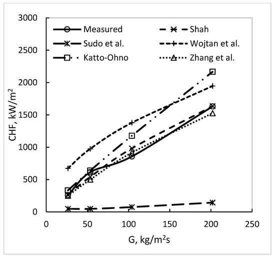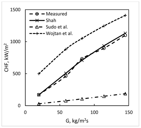 Gambill and Bundy (1961) [3] performed tests with water flowing downward in thin rectangular channels. As seen in Table 1, these are in good agreement with the correlations of Shah, Katto–Ohno, and Zhang et al. These data are shown in Figure 12.