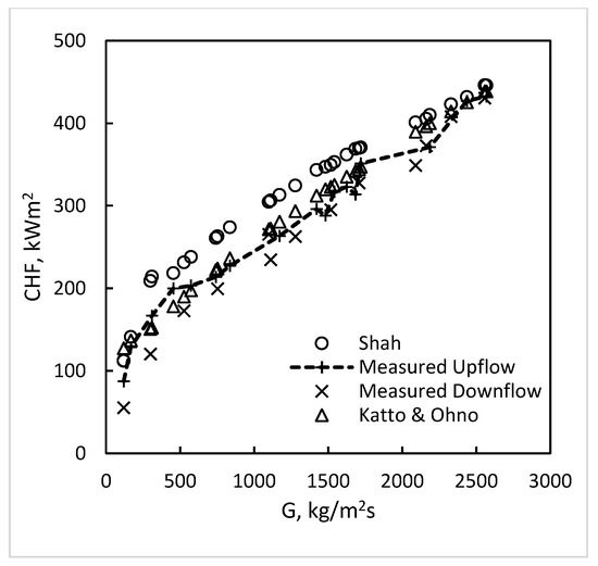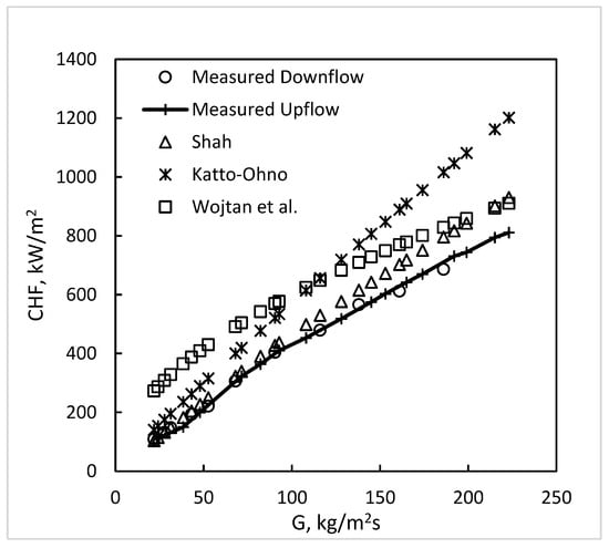 Figure 10 shows the ratio of CHF in downflow to that in upflow in the tests by Ami et al., (2015) [14]. It is seen that the ratio increases with mass flux, with downflow CHF becoming larger than upflow CHF by up to 15%. The data for both upflow and downflow for higher flow rates are considerably lower than the correlations of Shah, Katto–Ohno, and Zhang et al. These three correlations are very well-verified with a vast amount of water data. This indicates that these data at a high flow rate are unusual and, hence, were not included in Table 1 and Table 2.