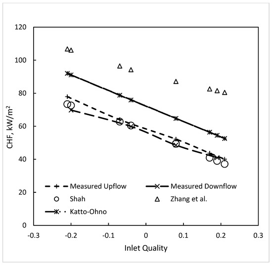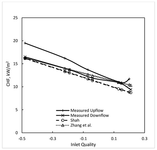 Figure 5 shows the data of Cumo et al., (1977) [7] for both upflow and downflow at the highest flow rate. It is seen that the downflow CHF at low inlet quality is a little lower than for upflow; meanwhile, at high inlet quality, they are about the same. The Shah correlation predictions are in-between the measured values in the two directions and, thus, in close agreement with both.