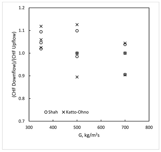 Figure 9 shows the ratio of CHF in downflow to that in upflow in the data of Lazarek and Black (1982) [8]. It is seen that the ratio is close to one over the entire range of mass flux. The inlet quality ranged from −0.25 to −0.02. Thus, inlet quality does not affect the ratio of upflow to downflow CHF, as indicated in the data of Cumo et al. Figure 6.