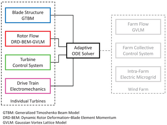 2.1. The CODEF Multiphysics Model for Wind Turbine/Wind Farm Dynamics and Its Modules