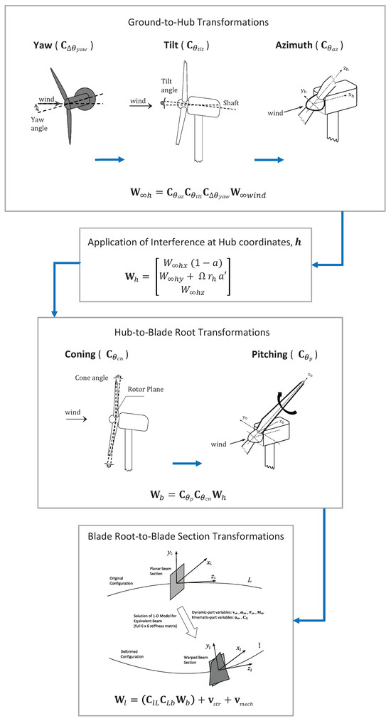 In the DRD-BEM module, the incoming wind velocity in the ground reference system, , is transformed through a series of orthogonal matrix linear operators. This gives the velocity vector in the system of coordinates of the blade section in its instantaneous deformed configuration, .