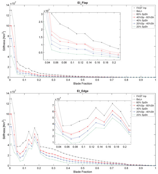 The span distribution of flap-wise stiffness (top) and edge-wise stiffness (bottom) for the SNL-NRT baseline blade and its flex variations.