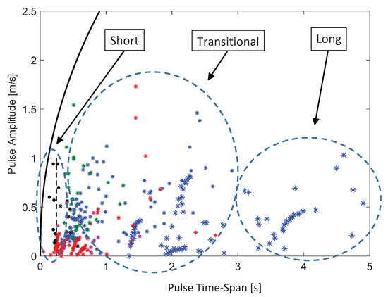 One of the essential steps in the ROC study presented in the work of Jalal et al. [18] was to design controlled gust pulses that represented the speed fluctuations found in the real-world environment. One way of doing this was to identify and quantify pulses with a characteristic time-span and amplitude that represented typical oscillations in wind speed in a statistical sense. To that end, samples of anemometer data from different sources were collected and classified in an amplitude versus characteristic time-span chart, depicted here in Figure 5. Three distinguishable regions were found in this chart, which are indicated by the encircling dashed lines: