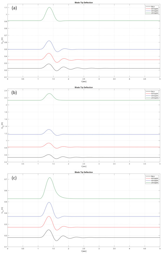 Examples of the time evolution of the blade tip axial deflection for the baseline blade and its three flexible variations. Pulse: 1 m/s Amp, 0.5 s Tsp over steady uniform-stream conditions. (a): WS = 6 m/s. TSR = 9, Pitch = 0°. (b): WS = 11.11 m/s, TSR = 6.197, Pitch = 0°. (c): WS = 15 m/s, TSR = 4.59, Pitch = 11.651°.