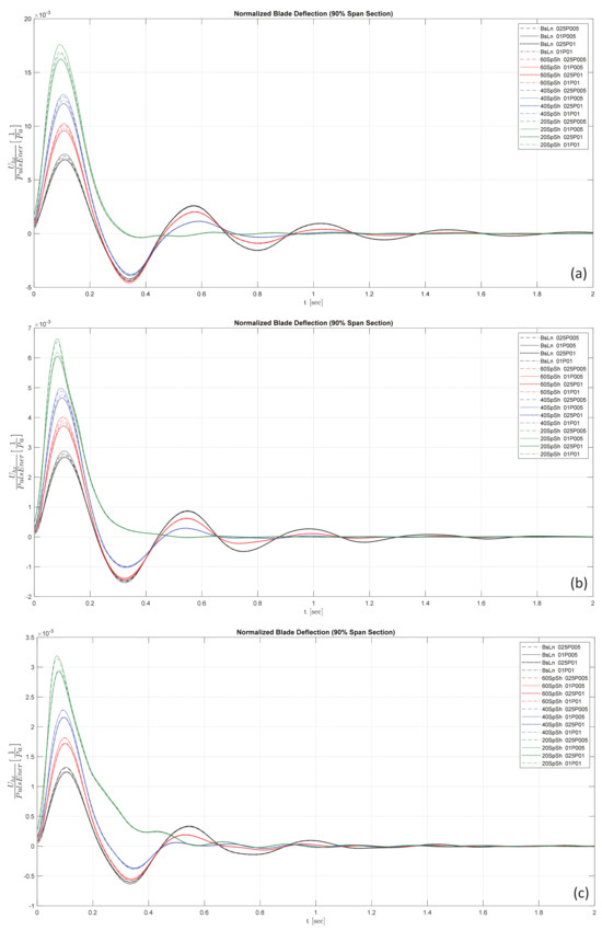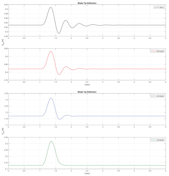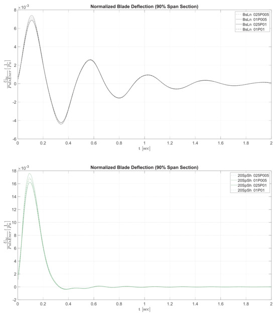 Figure 9 shows selected examples of the time evolution of the axial blade deflection at a position located at 90% of the blade span, for a sample of pulses applied onto a mean wind speed with steady uniform-stream conditions at WS = 6 m/s, with TSR and pitch values corresponding to the SNL-NRT design for that operational condition. Observing the behavior of blade parameters at the blade section located at 90% of the span is particularly convenient as, being as close as possible to the blade tip, it allows us to easily detect vibrational and deformational effects, but, at the same time, it is still far enough from the blade tip to avoid aerodynamic disturbances associated with blade tip effects [34]. That is, the position at 90% of the span represents a good spot for the well-balanced observation of variables associated with the combined structural and aerodynamic response of the blade.