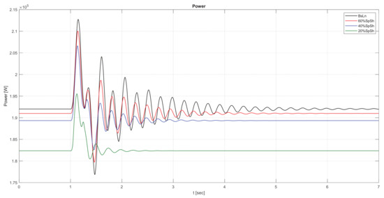 Other relevant operational parameters of the rotor show similar behavioral trends to the axial deflection. As an example, Figure 8 shows the time evolution of the power at the hub for one of the cases discussed before, WS = 11.11 m/s, which confirms the tendency to a faster dissipation of oscillations with increasing flexibility.