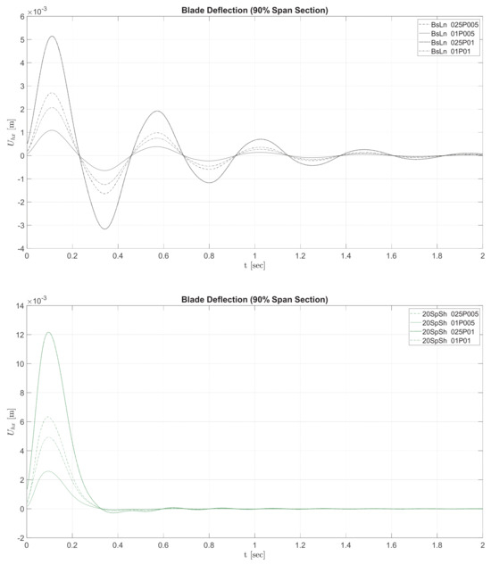 The time evolution of the axial blade deflection for a sample of pulses applied onto a steady uniform-stream mean wind of WS = 6 m/s, TSR = 9 and Pitch = 0°. (Top): Baseline blade. (Bottom): 20%SpSh flexible variation.