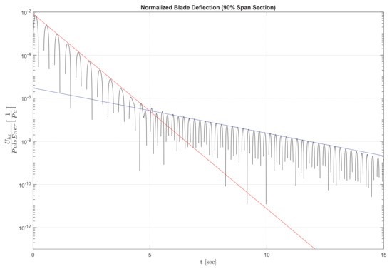 As previously mentioned, the ROC study presented in the work of Jalal et al. [18] found that the time evolution of the oscillatory response is characterized by an exponential decay associated with aerodynamic damping, which is exclusively determined by the speed of the background wind. The exponential nature of the oscillation’s decay also held for the SNL-NRT cases studied here. This fact becomes evident when analyzing the oscillating signals in a semi-log plot. Figure 12 shows one example of semi-log plot for the time evolution of the normalized blade deflection. It is clear that the time evolution of the oscillating signal exhibits an exponential enveloping curve, which is manifested as a linear relation when plotted in semi-log axes. This behavior was observed in all of the NRT cases analyzed.