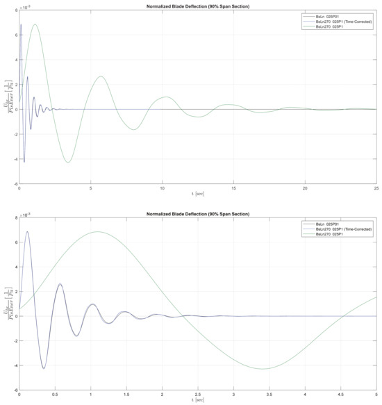 It is interesting to note that, for a basic cantilever beam of a constant section, the natural frequency of the first flap-wise mode scales inversely proportionally to the beam’s length. If the same basic notion is applied here to approximate the scaling of the first flap-wise mode frequency of the SNL-NRT blade, the period of the dominant oscillation of the up-scaled rotor would be 10 times higher. To test this hypothesis, a “time-corrected” version of the oscillatory signal for the 270 m rotor was computed, contracting the time axis by a factor of 10, to account for the change in frequency response due to the geometrical scaling. The blue line in Figure 14 shows this time-corrected version of the original green curve for the up-scaled rotor’s response.