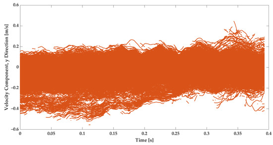 The velocity measurements in the X and Y directions both show fluctuations. Comparing Figure 3 and Figure 4 reveals that in the Y direction, the turbulence is more intense. This is due to the fact that the strain direction mainly points to this orientation [17]. That is, the velocity in the Y direction has a gradient that is caused by the strain. It is, therefore, much more visible than the velocity in the X direction. The literature emphasizes that the strain could lead to extra fluctuations [2,3,17]. Besides the strain and turbulence intensity, the geometry boundary influences the flow velocity [3].