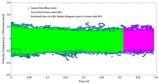 Figure 5 and Figure 6 illustrate that of the velocity time series are used to train the GRU model in this study. The rest of the data () are applied as test data to assess the predicted velocity via the GRU model.