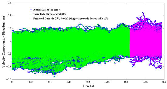 Velocity prediction of the velocity in the Y direction from the GRU model. The model is trained on of the data, while the remaining is used for testing. The filled blue circles are actual data, the green points are trained data, and the magenta points are GRU-predicted data.