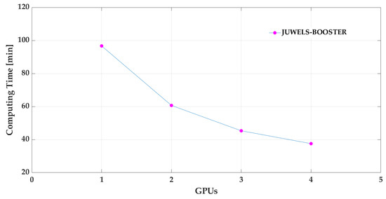 Computing time on the JUWELS-BOOSTER on one node assessed with one to four GPU for the GRU training model.