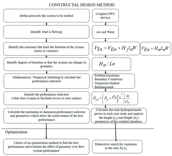 Additionally, the use of Constructal Design for the evaluation of the geometric configurations of CEO devices, particularly in the case of OWC devices, has been steadily increasing. Constructal Design is based on the Constructal Law, which initially served as a design tool to improve the performance of engineering systems or represent a natural phenomenon. Consequently, the Constructal Law deals with the transformations experienced by any flow system [13]. The geometry of the structures needs to be altered to maximize usage while minimizing energy consumption [14].