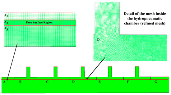 The stretched methodology consists of defining regions that are more refined than others. These regions are defined by the interest of the investigation, which in the present work is the free surface region and the interiors of the hydropneumatic chambers. Figure 4 presents the bidimensional computational mesh of the studied problem and its divisions.
