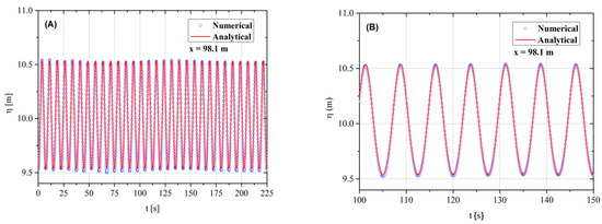 Comparison of the free water surface elevation for numerical and experimental results: (A) all simulation times; (B) detail of 100 s ≤ t ≤ 150 s.