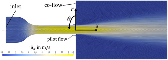 The reference data come from an LES dataset from a turbulent round jet [48,49]. The computational domain is shown in Figure 1. It consists of a converging nozzle, a straight duct, an annular inlet around the nozzle, and a large cylindrical plenum. The geometric configuration represents a jet flame combustor, where, under reacting conditions, fuel is injected at the annular inlet, which is called the pilot flow nozzle. Here, under non-reacting conditions, air is injected at the pilot flow inlet. In total, the domain has three inlets: the main inlet at the converging nozzle, the annular pilot, and the co-flow inlet. The co-flow is used to prevent undesired recirculation and improves numerical stability. Although the boundary conditions and geometry of the setup hold greater technical relevance, the underlying flow fundamentals remain comparable to those of a generic round jet.
