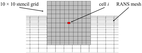 However, the use of the stencil method also presents technical challenges. Typically, numerical grids are non-uniform, so that, depending on the target cell under consideration, different numbers of grid points lie within the stencil region. To overcome this difficulty, the stencil is constructed with equidistant points, and a routine is implemented that interpolates the mean flow quantities from the non-uniform RANS to the equidistant stencil grid. This ensures that the function always receives the same number of input values with the same distance to the target cell. A symbolic representation of the stencil grid on top of the RANS grid is visualized in Figure 3.