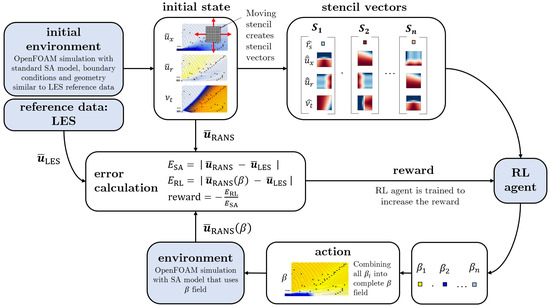 To identify the -function that leads to a good alignment of the RANS solution with the LES mean field (Equation (4)), deep reinforcement learning is used. Reinforcement learning is based on an agent observing its environment, acting, and receiving a reward for its actions. The agent tries to choose its actions in such a way that it maximizes the reward received. Rewards can, but do not have to, be granted after every action. They can be given after a sequence of actions. According to Sutton and Barto [55], the two most characteristic features of reinforcement learning are trial-and-error search and delayed reward. One episode of training consists of multiple interactions in which the agent observes the state and performs an action. One round of chess, for example, consists of multiple moves. For each move, the agent receives the results of its last actions as a new state. This can be described as a closed-loop system, which is the classical design of RL frameworks.