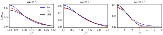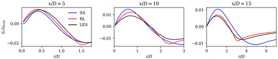 Initially, the velocities were compared because they are decisive for error calculation. Figure 5 and Figure 6 show the axial and radial mean field velocities normed with the bulk velocity at different axial positions (from left to right) of the reference LES data (black line), the SA model (blue line), and RL model results (red line). Overall, it can be observed that the velocity profiles of the RL model are closer to the LES mean fields compared to those of the SA model. The RL model gives better results close to the jet centerline for the axial velocity at and 10, as well as for the radial velocities at and 15.