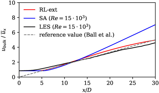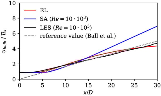 Axial velocity decay (Equation (9)) showing results of standard SA model, RL model, and LES data, as well as reference value according to Ball et al. [64].