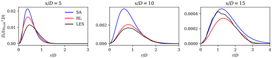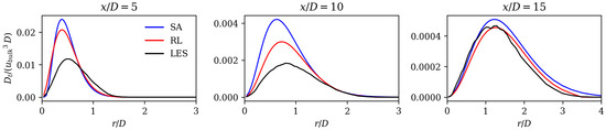 Figure 9b,e,h, display the turbulent production for the LES, and the mean field dissipation predicted by the RL and the SA models, respectively. All three fields show a very similar shape with high values close to the nozzle in a flow region of strong mean shear. To further highlight the differences between the models, Figure 10 shows radial profiles of the same quantities at four axial positions. The presented results show that the SA model overestimates the mean field dissipation (or turbulent production) at 5 and 10, while the RL model shows substantial improvement in that region. Further downstream at 15, the RL model does not show a superior performance compared to the SA model. This is in contrast with the superior prediction of the spreading rates and axial velocity decay values as seen in Figure 7 and Figure 8, which can be attributed to two possible explanations. Firstly, the magnitudes of the values downstream 15 are considerably lower compared to 5 and 10. Secondly, the convection of turbulent kinetic energy may lead to nonlocal effects. In the upstream region at 5 and 10, the RL model demonstrates improved performance compared to the SA model. As turbulence is convected downstream, the local impact of the RL model significantly influences the downstream mean field, even if the values there are not substantially superior to those of the SA model.