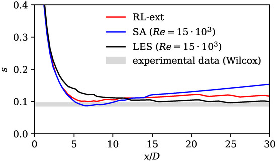 where describes the radial position where the axial velocity equals half of the centerline velocity . According to experimental data, the spreading rate is between and in the far field [4]. Figure 8 shows the jet spreading rate for the three cases considered, together with the experimental data according to Wilcox [4]. All curves show large deviations from the literature upstream of . This is expected, as the experimental value only holds in the self-similar far field region of the jet. Apart from a small region near the nozzle between and , where the SA model shows the best prediction of the spreading rate, significant differences between the experimental results and the results based on the standard SA model can be seen. Further downstream and in the majority of the domain, the results of the LES and RL model are very close to the experimental data and show an almost constant spreading rate over a large distance in the direction of flow. In this range, the RL model shows a significant improvement compared to the standard SA model. This shows, again, that the SA model substantially overestimates the turbulent production in the downstream region.