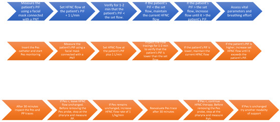 The Pro_HFNC was clinically tested on five infants under six months of age who were treated with HFNC for mild to moderate respiratory distress. The clinical protocol is shown in Figure 4 in two flowcharts (blue and orange background). Pes measurement may or may not be included. Prior to commencing the HFNC, an esophageal catheter was inserted to measure Pes and a ventilatory mask connected to a PNT (PNT_2) was applied on the infant’s face to measure PIF. The first 20 s of monitoring were discarded due to the potential effect on the flow signal of the trigeminal reflex elicited by the mask’s contact with the face. When the flow signal was stable and the breathing was regular, we assumed that the PIF measurement was accurate. At this point, the HFNC flow rate was set 1 L/min higher than the infant’s PIF. After HFNC was initiated, we measured the infant’s PIF while the facial mask was applied to the infant’s face without moving the nasal cannula. Once again, the first page was discarded, and the flow signal was recorded for 60 s (3 monitor pages). All signals were analyzed offline.