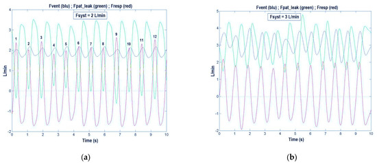 The blue trace shows the high-flow nasal cannula (HFNC) flow delivered to the patient (Fvent) and the green trace shows the total flow leak from patient (Fpat_leak), which represents the difference between Fvent and the respiratory flow (Fresp, red trace). The three traces permit us to verify if the Fvent meets the patient’s inspiratory flow demands, i.e., if the condition Fvent > Fresp is always true or, alternatively, if the condition Fpat_leak > 0 is always true. (a) Fsyst = 2 L/min: Fvent is insufficient in several breaths: 1, 3, 6, 7, 9, 10, 11, and 12. (b) Fsyst = 3 L/min: Fvent always meets the patient’s flow demands (Fvent is always higher than Fresp) (see Section 3.1).