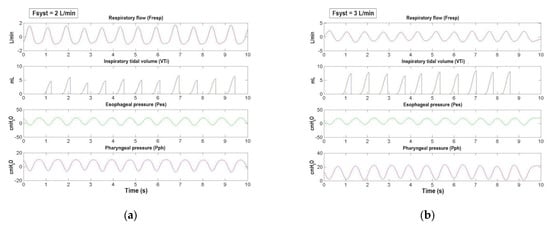 From top to bottom are shown the synchronized signals of respiratory flow (Fresp, red race), inspiratory tidal volume (VTi, dark gray trace), esophageal pressure (Pes, green trace), and pharyngeal pressure (Pph, magenta trace) of a representative infant as a function of time. (a) As we showed in Figure 5a by using Fvent, Fpat_leak, and Fresp signals, in this figure (Fsyst = 2 L/min) we confirmed how Fvent was insufficient to meet Fresp by using the Pph signal, whose troughs are always negative. (b) Differently from (a), in this figure (Fsyst = 3 L/min), Fvent is increased to meet Fresp. This condition is confirmed by the troughs of the pharyngeal pressure, which are always positive (see Section 3.1). From these signals it was possible to calculate the most significant parameters of the patient’s respiratory profile (see Section 3.2).