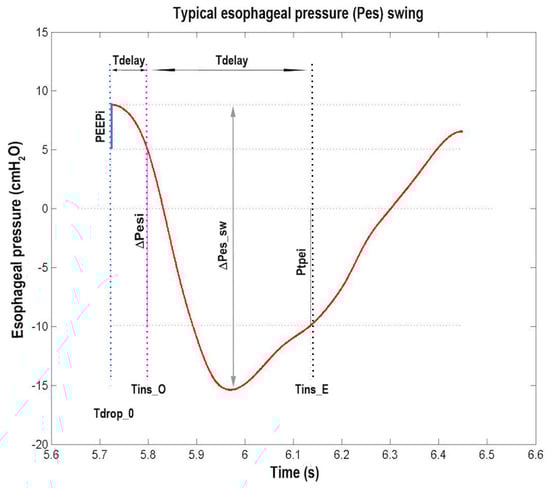 The PRESSURE routine implements the algorithm that defines the beginning of the inspiratory effort, i.e., beginning of negative Pes drop (Tdrop_0), and computes the interval between Tdrop_0 and Tins_O (i.e., Tdelay). The PRESSURE routine also computes the intrinsic positive end expiratory pressure (PEEPi), total change in Pes across inpiration (∆Pesi), transpulmonary pressure at end of inspiration (Ptpei), dynamic lung compliance (CLdyn), and total lung resistance (RLtot). PEEPi was determined as the difference between Pes at Tdrop_0 and Pes at Tins_O, ∆Pesi as the difference between Pes at Tins_O and Pes at Tins_E, whereas Ptpei as Pes value at Tins_E. CLdyn was determined as the ratio of VT to ∆Pesi, while RLtot as the mean difference between total and static Pes values divided by the mean Fresp, both evaluated considering Tins interval. The inspiratory static Pes curve (Pesst) was extrapolated by dividing VTi by CLdyn. In addition, the peak-to-peak variation in Pes swing (∆Pes_sw) was calculated.