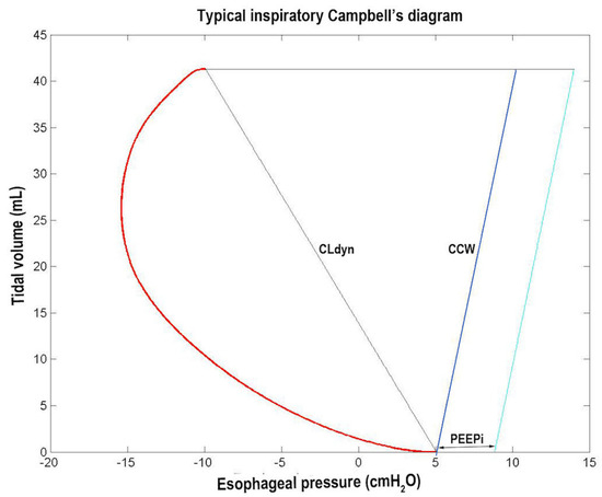 Finally, Figure 9 shows the curve and lines (CLdyn, CCW) composing Campbell’s diagram, while Figure 10, the different areas corresponding to the different inspiratory WOB components and how they were computed (see Section 2.7.2).