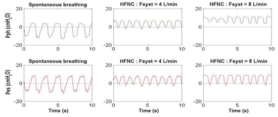 Pharyngeal pressure (Pph, upper panels, blue traces) and esophageal pressure (Pes, lower panels, red traces) waveform as a function of time in a representative patient weighing 4 kg with mild respiratory distress during spontaneous breathing (left panels), on high-flow nasal cannula (HFNC) with Fsyst at 4 L/min (middle panels) and at 8 L/min (right panels). Note that the Pes swings were quite similar between HFNC 4 and 8 L/min indicating that there was no further effect of flow on the respiratory effort (see Section 3.2).