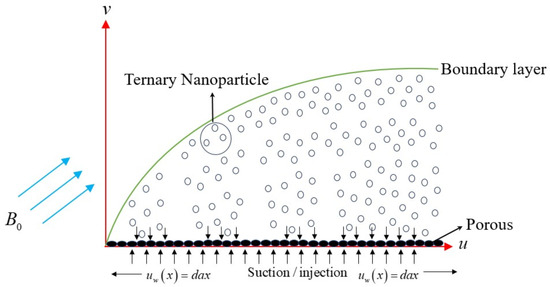 Consider the steady two-dimensional, incompressible, viscous, laminar flow of a ternary dusty nanofluid across a permeable stretching/shrinking surface. The surface is parallel to the x-axis and normal to the y-axis (Figure 1); the stretching/shrinking sheet is parallel to the y-axis, and the momentum of the fluid flow is assumed as . The added ternary nanoparticles are copper (Cu), silver (Ag), and titanium dioxide , with water as the base fluid.