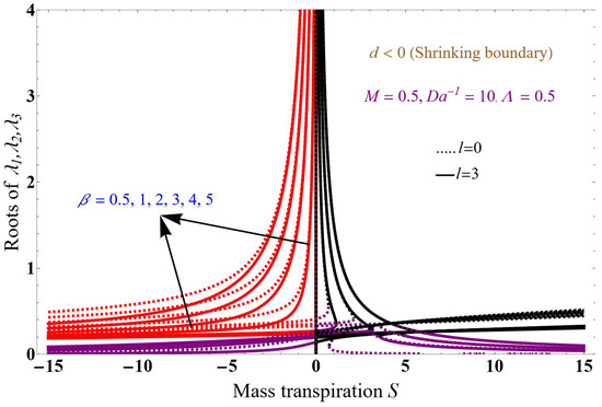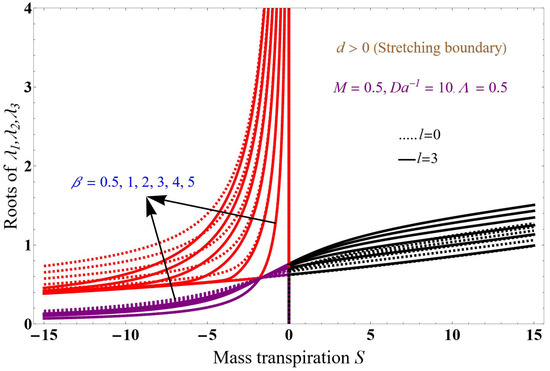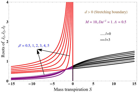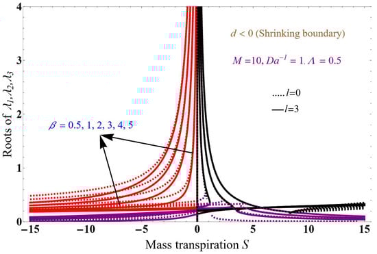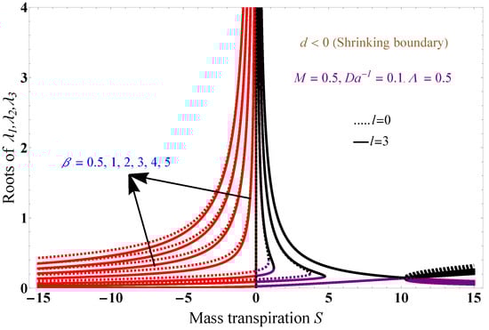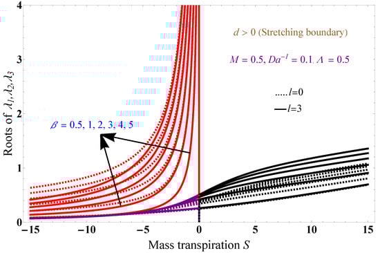 Figure 4 and Figure 5 show the solution concerning mass transpiration. The black solid and dotted lines correspond to , red solid and dotted lines correspond to , and purple solid and dotted lines correspond to roots, with a magnetic field of 0.5, inverse Darcy parameter of 10, Brinkman number of 0.5, and variation in . Figure 4 is obtained when stretching the boundary (d = 2), and Figure 5 when shrinking the boundary (d = −1.2) for two different values of mass number l, where the mass number is l = 0 (dotted lines) and l = 3 (solid lines); all three solutions are in the positive x-axis.