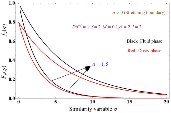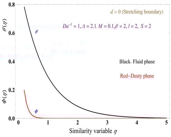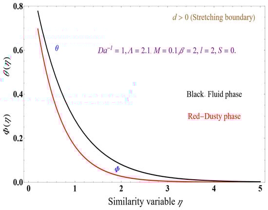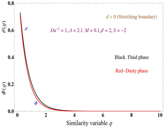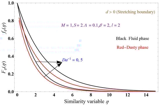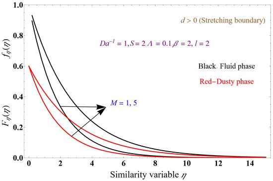 Figure 8, Figure 9 and Figure 10 show the dusty- and fluid-phase velocity profile plots concerning similarity variables, where the red lines denote the dusty phase and the black lines represent the fluid phase for a stretching boundary. Figure 8 corresponds to inverse Darcy numbers 0, 5. This condition will restrict the flow of both phases. Due to the permeable factor, which imposes frictional and drag forces on the liquid, the following values are used for the various parameters: the magnetic field is 1, the mass suction is 2, the Brinkman number is 0.1, the mass number is 2, and the fluid particle interaction parameter is 2. When increasing the inverse Darcy number, both fluid phases and the velocity profile decrease, and the fluid phase is more dominant than the dusty phase. The momentum of the ternary nanofluid phase and dust phase is decreased. Only one solution is obtained. As shown in Figure 9, for variation in the magnetic field M = 1, 5, the magnetic field encourages the resistive Lorentz force which is present in an electrically conducting fluid. This force resists the fluid particle’s momentum, which lowers the fluid’s velocity in the stretching sheet. When increasing the magnetic field, both the fluid- and dusty-phase velocity profiles decrease, and the fluid phase is more dominant than the dusty phase; it reduces the momentum of TNF and the dust phase. The Brinkman parameter is the relation between drag force and density. Therefore, the drag force increases when increasing the values of the Brinkman number, which slows down the fluid velocity. A rising Brinkman parameter reduces the ternary fluid velocity and decreases the dusty-phase velocity.