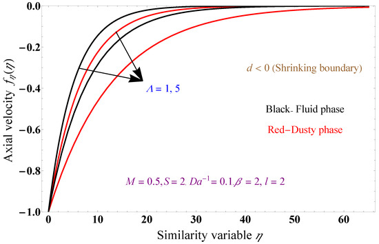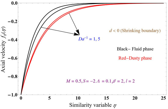 Figure 11, Figure 12 and Figure 13 show the axial velocity profiles for the inverse Darcy number 1, 5 values that resist the fluid flow. The flow paths for the fluid in both phases are restricted due to improvement in the permeable factor, which exhibits frictional and drag forces on the liquid. The results include mass suction and injection values and a shrinking boundary while keeping the magnetic field at 0.5, mass transpiration values of 2, −2, and inverse Darcy number of 0.1. The momentum profile in both the fluid and dusty phases decreases with upsurges in the inverse Darcy number compared to the graph in Figure 8, which shows almost similar phenomena for stretching and shrinking boundaries. Figure 8 shows nearly similar phenomena for both stretching and shrinking boundaries. Figure 13 shows the Brinkman parameter for the shrinking boundary and mass suction values. The drag force increases with increasing Brinkman number values, slowing the fluid velocity. Increasing the Brinkman parameter decreases the velocity of the ternary nanofluid phase, and the dusty phase slowly decays compared to the liquid phase.