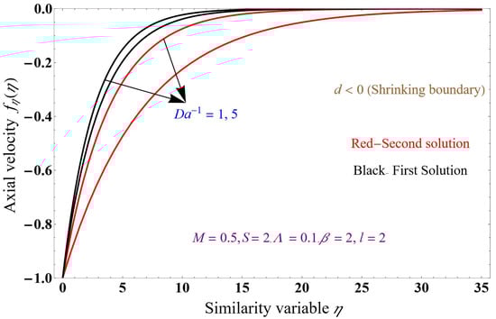 where , , , , and are constant terms; denotes the mass number of dust particles; denotes the particle-phase density, fluid–particle interaction parameter denoted as . The Prandtl number is given by . S is the mass suction/injection parameter; the particular heat coefficient is ; the temperature of the fluid interaction component is ; the Eckert number is denoted as ; the inverse Darcy number is ; the radiation parameter is ; and the heat source/sink parameter is given by , where d denotes a stretching/shrinking parameter.