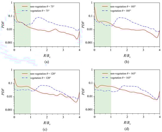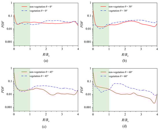 - Spatial–temporal sediment heterogeneity, as measured by PDF variance, differs notably between cases. In non-vegetated flows, variance increases towards the outer wall in the bending region. Vegetation-induced turbulence in vegetated cases leads to higher variance, particularly in the mixing layer subzone (1 < R/Bv < 2), showcasing the pivotal role of eddy size in sediment redistribution.