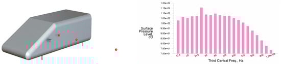 To validate that the predicted far-field noise increases due to the lightbars were correct, a validation study based on the 2024 work by [] was performed. The exact SAET4 square-back body provided in the research data of the article was used. A simulation domain was created around the body to match that used throughout this article, and a hybrid LES was performed with settings matching those discussed in the Methodology section above. Figure 2 outlines the geometry used and the respective locations of the receivers, while Table 2 shows the comparison between the values predicted by using this study’s CFD methodology and that of []. There is good agreement between the noise levels predicted in the near field of the body, as seen by the values at the first two receivers deviating by only 1.27 dB and 2.53 dB, respectively. The third receiver, which was a considerable distance away from the body, shows the highest deviation, which is acceptable, as the level of mesh refinement at this point is different between the two simulations. Additionally, the CFD work carried out by [] draws its validation from wind tunnel tests to predict noise on this body outlined in [,]. Both studies identified an aeolian tone of 40 Hz at a surface probe positioned nearest the mirror, which was predicted by this study as outlined in Figure 2. Based on these results, it can be concluded that the noise predictions throughout this study have a good degree of validation against acoustic wind tunnel data [,] and similarly derived published CFD work [].