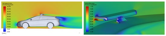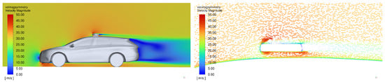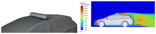 Aerodynamic noise generation related to road vehicles results from three different noise generation mechanisms. Mass flows through leaks and small openings (monopoles), impulses on surfaces due to pressure fluctuations (dipoles), and from turbulent free flows such as in the wake of a vehicle (quadrupole). Dipoles are the main source of noise in road vehicles, as quadrupole sources have low noise emission and monopole sources are eliminated for well-sealed vehicles []. Note that the acoustic power of a dipole grows with the sixth power of its speed []. This is particularly important for add-on parts that cause the flow to speed up, for example, as the flow passes underneath a lightbar or around a wing mirror. Predicting far-field noise requires a transient simulation, which has the underlying need for a hybrid-LES approach, to provide reliable predictions of flow fluctuations, which can be used to predict sound emission from sources such as vehicle panel work, which can then be received in the far field with a designated receiver.