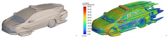 The modelling of airflow over ground vehicles can be effectively accomplished through a continuum approach, focusing solely on macroscopic interactions. In this context, each fluid element represents the average behaviour of numerous fluid particles across both space and time. Air was modelled as an isothermal Newtonian fluid with constant viscosity and density. The constant density assumption was justified as the investigated flows had Mach numbers below 0.3, minimising compressibility effects. The governing equations that form the basis for CFD simulations are the Navier–Stokes equations (Equations (