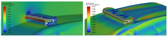 For the hybrid LESs, the SBES model was used with the Dynamic Smagorinsky model applied as the sub-grid-scale model. The SST model was used to model turbulence for the RANS portion of the hybrid approach. A coupled pressure–velocity scheme was used with the recommended bounded central differencing applied to momentum discretisation. A first-order implicit scheme was used for the transient formulation. A refined mesh was created for the hybrid LESs, where additional refinement regions were applied around the vehicle and in its wake. In general, the cell count for these simulations was 60–70 million. Due to limitations on computational resources, half models using the symmetry boundary condition were still used even though the resolving of turbulent structures using LESs provides an inherently nonsymmetric solution. The error associated with this is limited when calculating noise at receivers away from the symmetry plane []. The simulations were first initialised with a RANS simulation and then allowed to run for 2640 timesteps with a timestep of s. Five inner loop iterations were used per timestep. The averaging of the flow quantities was performed for the last 3 flow passes, with the full simulation taking around 6.5 vehicle flow passes. In general, the force coefficients converged after 2 flow passes. The timestep was chosen to ensure a CFL of 1 or less around the vehicle and in its wake. There were sections very near to the vehicle where the flow was accelerated or the cell size was reduced where the CFL number rose above 1. A verification simulation with a timestep of s was performed to confirm if the larger timestep was appropriate. The results showed a and a of only 2 counts and 4 counts, respectively, which verified that the larger timestep was sufficiently small and practical for efficient use of the computational resources []. Ideally, the mesh resolution for these types of transient simulations should be higher, and the number of flow passes used before and during averaging should be much higher, but due to limitations on computational resources, this could not be achieved. Nevertheless, the results for these simulations agreed well with the results of the high-fidelity RANS simulations.