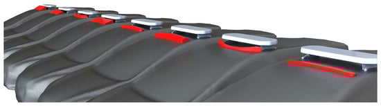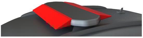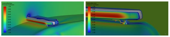 The best-performing positional change, as expected, was to reorientate the standard lightbar longitudinally while maintaining the same mounting mechanism for fairness in the comparison. A total drag reduction of 5% was reported; it primarily came from the 10-drag count reduction reported for the lightbar’s surfaces. Additionally, the roof drag component was reduced by 4 counts, as the high-pressure zone ahead of the lightbar became significantly diminished and enabled enhanced thrust on the forward-facing parts of the roof, as seen in the right image in Figure 9. These savings are then slightly offset by a 3-drag count increase at the rear of the vehicle due to faster-moving flow on separation and a 1.5-drag count increase at the i40’s front, which comes from the removed benefit outlined in Section 4.1 of having a high-pressure zone ahead of the lightbar that affects the stagnation flow upstream. Combined with small miscellaneous changes on other surfaces totalling a 0.5-drag count increase, the configuration had a net 9-drag count decrease. Lastly, based on the results in Table 4, it is clear that for a straight-back vehicle like the Hyundai i40 estate, mounting the lightbar on the C and D pillars had approximately the same drag effect as when mounting on the B pillar. This was again down to the low-drag nature of the standard lightbar and because of the straight-back roof on the vehicle. If, however, this configuration were applied to a vehicle with a rearward-sloping roof, mounting the lightbar further back would give rise to substantial drag increases, as the disturbed flow field after the lightbar would negatively affect the drag forces on these sloped surfaces, similar to what was outlined in [].