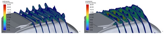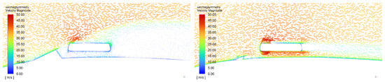 A drag-reducing-ramp study was proposed based on the results of [], where substantial drag reductions were realised through the utilisation of an aero ramp ahead of a protrusive taxi sign. The goal was to see if a ramp could be used to alter and improve the flow’s paths as it transverses the lightbar to reduce stagnation, slow the flow, and reduce the turbulence that occurs downstream of the lightbar. This was all to be achieved while minimising the self-drag component on the ramp so as not to offset any drag savings on the lightbar. Figure 12 shows the eight different ramp designs that were tested, while Table 7 outlines their respective drag changes. As it is clear from the table, all eight designs failed to reduce the base drag on the Hyundai i40 Marked. The key issues were that the ramps in most cases increased the roof drag component and in some cases caused noticeable drag increases at the rear of the vehicle due to the increase in the size of the wake behind the lightbar and the increase in the level of turbulence downstream of it. This was especially true for the worst-performing ramps. For example, DRR 7 did succeed in reducing the drag on the lightbar by 12 counts but then offset this by 9 counts due to ramp self-drag, followed by a large 11-drag count increase at the roof and a 16-count increase at the rear of the vehicle. Both the rear and roof drag increases were resulted from detached turbulent airflow after the ramp, which is clearly shown in the left image in Figure 13.