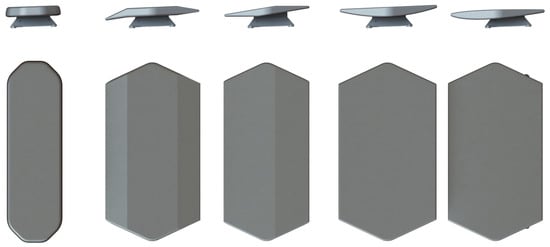 While the results so far have indicated that the current generation of lightbars, which uses a standard low-profile rectangular section, has adequately low drag, it is of interest to investigate how the drag could be reduced when using a modified lightbar profile. This is especially important to police departments and emergency services that have set targets for emission reductions and would consider including a specification for a more aerodynamic lightbar profile in their next tender to suppliers. To begin, four initial alternative profiles were investigated, as shown in Figure 15. V1 and V2 were designed to direct flow over the top of the lightbar, whereas V3 and V4 encouraged flow underneath the lightbar by using airfoil-like shapes. All lightbars were fitted to the Hyundai Kona, and for fairness in the comparison, the same mounting brackets and mounting positions were maintained for all configurations. The overall dimensions were similarly preserved, except for their stream-wise lengths, which increased slightly over the baseline lightbar to facilitate pointed ends at the front and rear of the lightbar.