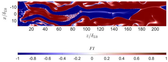 where represents the mass fraction, and the subscripts and stand for fuel and oxidizer, respectively. If combustion occurs in premixed conditions, both reactants are depleted simultaneously, and their gradients are aligned, yielding . The opposite happens if combustion is locally non-premixed, with the gradients of fuel and oxidizer being opposed. In such a case, the flame index tends to . An example of the instantaneous flame index is provided in Figure 1. As can be seen, this parameter presents an almost binary distribution. This observation is in agreement with the trends found in one recent study []. The pattern near injection displayed in Figure 1 corresponds to the typical triple-flame structure [], with a non-premixed branch surrounded by one lean premixed branch and one fuel-rich premixed branch.