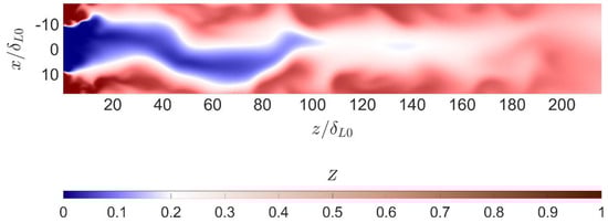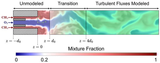 where is the mass fraction of the chemical species. Obviously, this parameter tends to unity near the fuel and to zero close to the oxidizer injection. For methane–oxygen combustion, the stoichiometric oxidizer-to-fuel ratio is , with a corresponding stoichiometric mixture fraction . An example of the instantaneous mixture fraction can be observed in Figure 2. In this graphic, oxygen is injected at the center left and methane at the top and bottom. The overall configuration is fuel rich (), and this can be verified by observing the composition at downstream conditions, where the flow is well mixed, and the mixture fraction ranges from stoichiometric to mildly fuel rich.