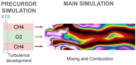 Two simulations are necessary to obtain the aimed turbulent diffusion flame. First, a precursor simulation is conducted to obtain realistic turbulent inlet boundary conditions. These fields are patched as the inlet boundary condition for the main simulation, where turbulent mixing and combustion take place. This second simulation is the one relevant within the scope of the present work. The overall scheme can be visualized in Figure 4. The described database has been used in previous research [], and the reader can find a more detailed explanation concerning the simulation setup in the study. This text is limited to a brief description for the sake of conciseness.